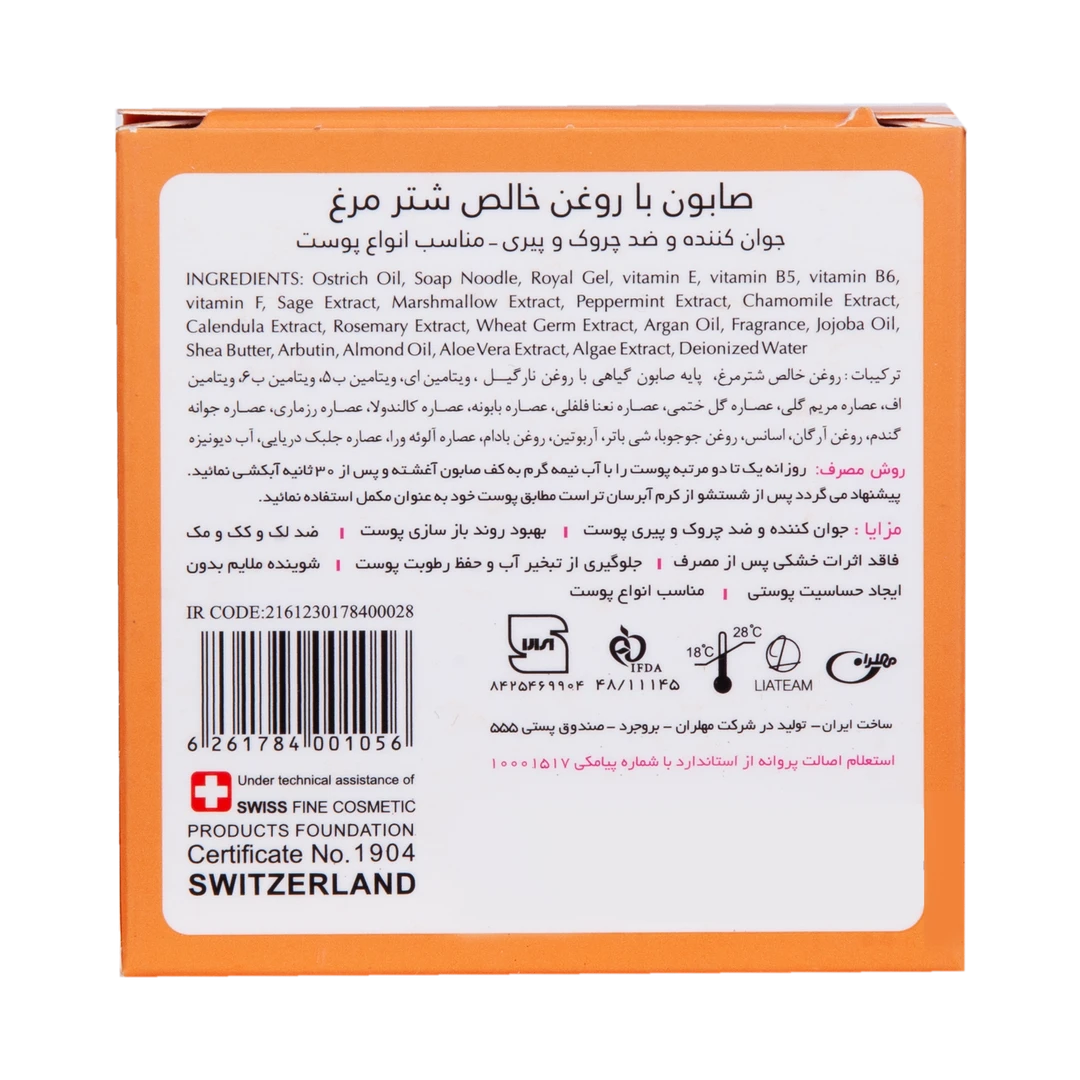 نوع عصاره: عصاره شترمرغ، روغن آووکادو، روغن نارگیل، روغن زیتون، روغن جوجوبا، روغن بادام، روغن جوانه گندم، روغن کالندولا، شی باتر
